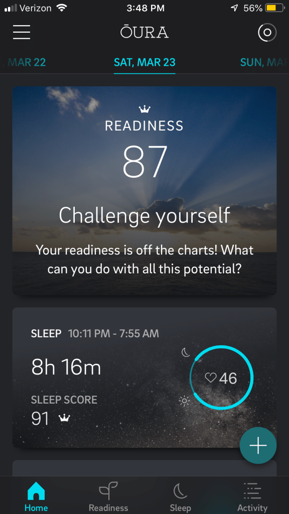 For example, on this day, my readiness was 87/100 (anything over 85 is ideal). So the app tells me, “Challenge yourself. Your readiness is off the charts! What can you do with all this potential?” Among the data it considered was that I had slept for eight hours and 16 minutes, my sleep score was 91/100 (it also breaks down the why behind that score, as well), my resting heart rate was in its typical range, I had met my previous day’s activity goals, and I went to bed close to Oura’s recommended bedtime based on its assessment of my circadian rhythm. I also hit the minimums for each phase of sleep (rare for me). It did, however, seem to feel that my sleep and activity levels were not quite in balance. Cool Stuff.